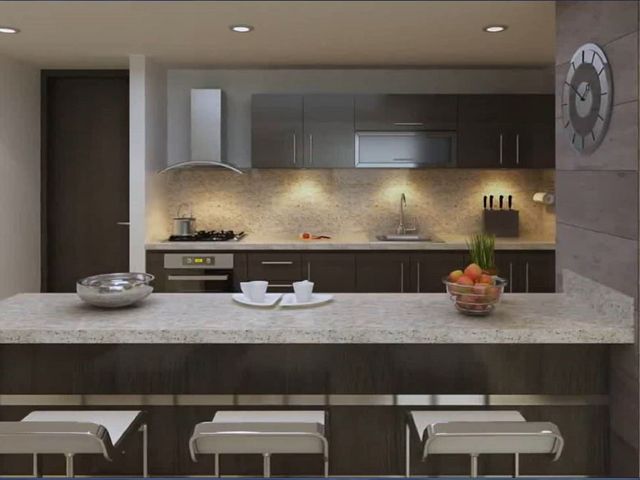 • Pisos para la sala y el comedor en Porcelanato Beige 60×60 o similar. • Pisos para el balcón en Porcelanato Beige 60×60 o similar. • Pisos paras las alcobas, pasillo y estar de alcobas en porcelanato Beige 60×60 o similar. • Muros estucados y pintados con vinilo tipo 1. • Baños con muros enchapados con cerámica nacional 30X30 en zona húmeda y estuco plástico en zona seca. • Piso baños en zona seca en porcelanato beige de 60×60 o similar. • Piso baños en zona húmeda en porcelanato sandstone 30X60 o similar. • Porcelana sanitaria referencia prestigio o similar. • División de baño. • Lavamanos cerámico para incrustar de pedestal o similar, mueble en madera o similar en baños, a excepción del baño del servicio. • Grifería de 8 pulgadas grival o similar. • Tubería de agua fría/caliente. • Muros de cocina con estuco plástico y Pisos en porcelanato beige de 60×60. • Mesones de cocina en granito de mármol blanco jade o similar y mueble semintegral, gabinete mueble de madera en madecor y formica. • Lavaplatos de acero inoxidable. • Horno y estufa a gas. • Campana extractora. • Zona labores con piso en porcelanato beige de 60×60 o similar. • Cielo raso en dry Wall con dilatación perimetral sin molduras o similar. • Carpintería en madera tipo loft entamboradas y enchapilladas. • Interiores de closet aglomerado; colgadera, 2 gavetas y entrepaños, superficie para maleta superior, puertas en triple tipo loft. • Ventanería metálica, puerta ventanas en aluminio 8025 o similar y ventanas 5020 con perfilería en aluminio natural o similar y vidrio green de 5mm o similar. • Preinstalación tuberías AA en habitaciones y sala-comedor. • Luminaria LED.