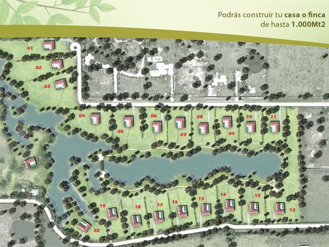 • 20 Lotes desde 2.400 m2 • Conjunto cerrado • Portería y vigilancia • Vías mejoradas e iluminadas • Lago natural • Sendero peatonal ecológico • Linderos en cerca natural • Servicios de energía, agua potable y fosa séptica • Diseños arquitectónicos y estructurales • Casa de 140 m2 (Construcción opcional)