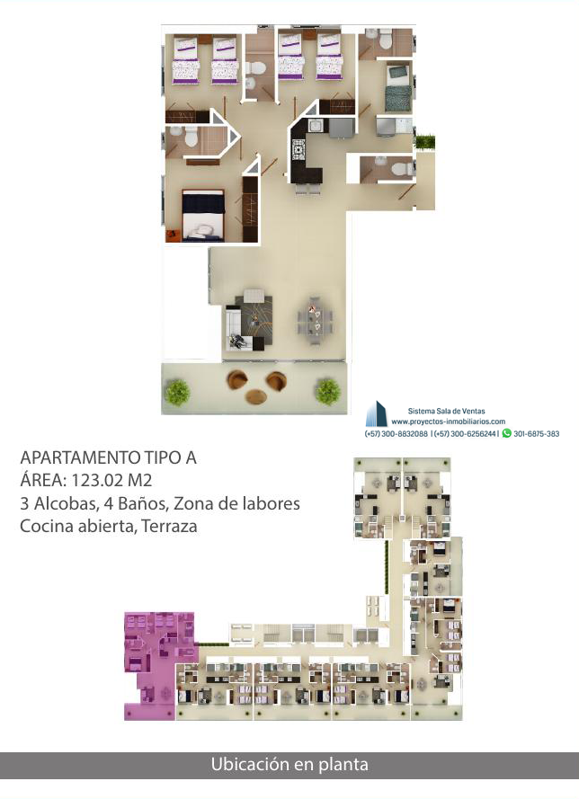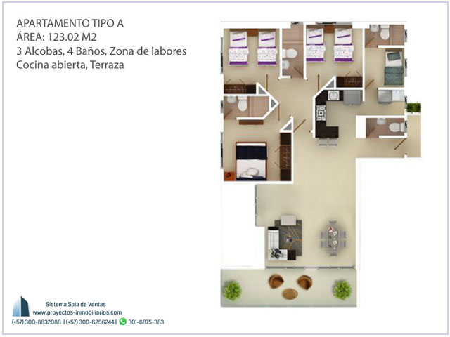 Apartamento Tipo A - Área : 123.02 m2 - 3 habitaciones, 4 baños, zona de labores, cocina abierta, terraza.