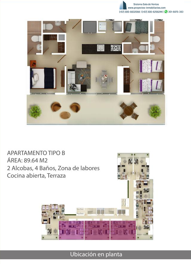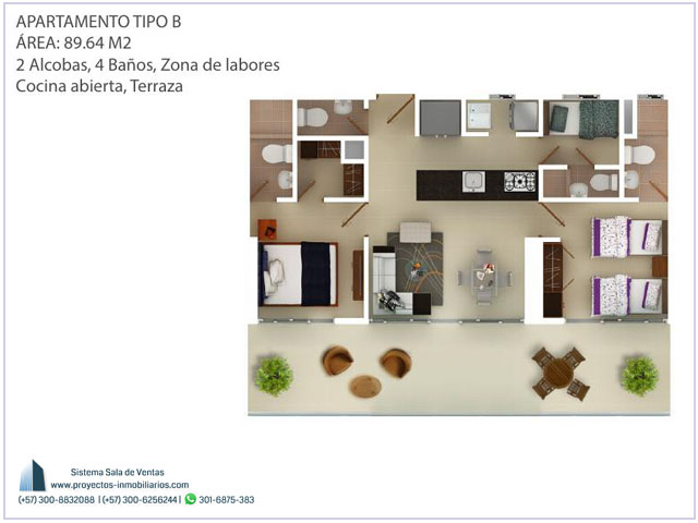 Apartamento Tipo B - Área : 89.64 m2 - 2 habitaciones, 4 baños, zona de labores, cocina abierta, terraza..