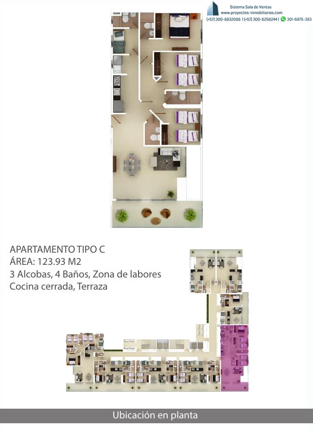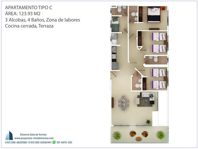 Apartamento Tipo C - Área : 123.93 m2 - 3 habitaciones, 4 baños, zona de labores, cocina cerrada, terraza.