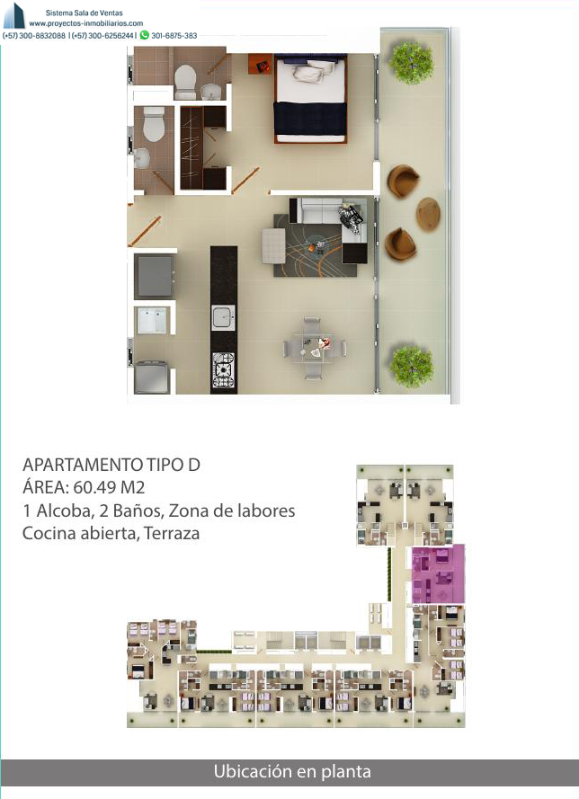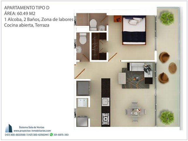 Apartamento Tipo D - Área : 60.49 m2 - 1 habitacion, 2 baños, zona de labores, cocina abierta, terraza.