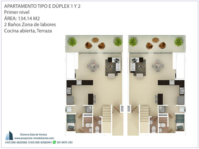 Apartamento Tipo E Dúplex 2 Niveles - Área Nivel 1: 134.14 m2 - 2 baños, zona de labores, cocina abierta, terraza.