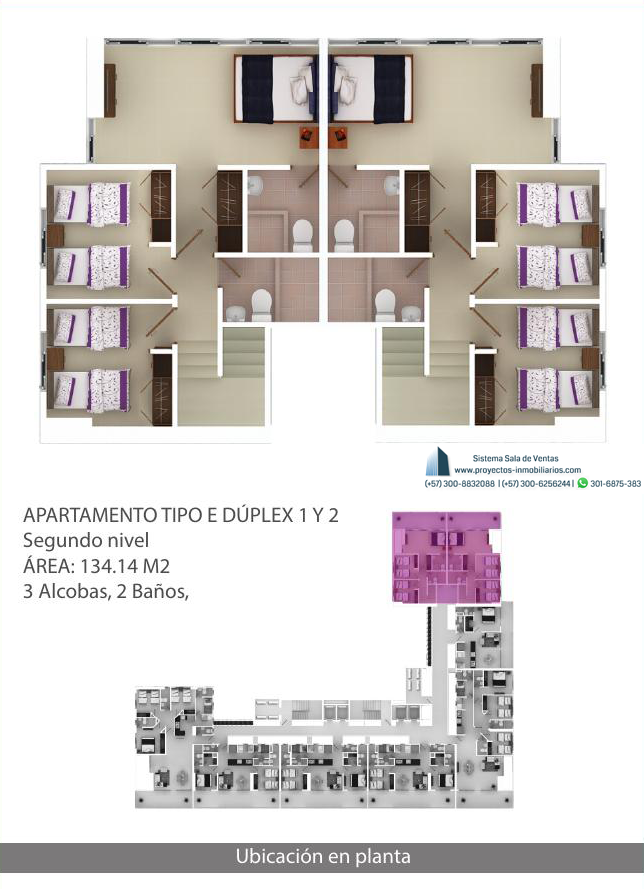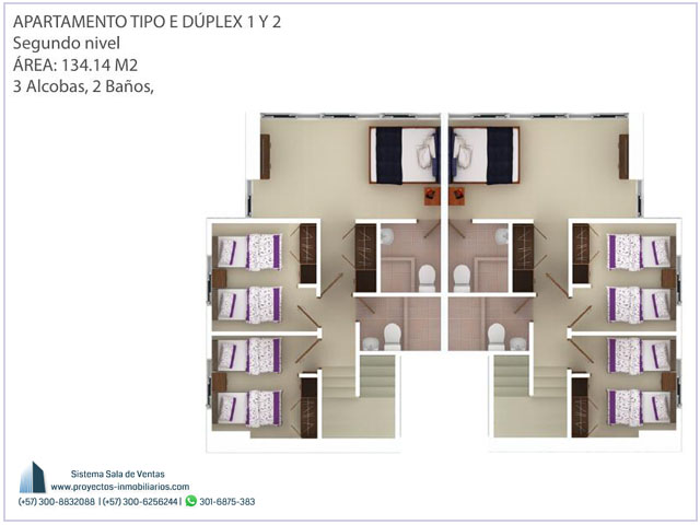 - Área Nivel 2: 134.14 m2 - 3 habitaciones, 2 baños.
