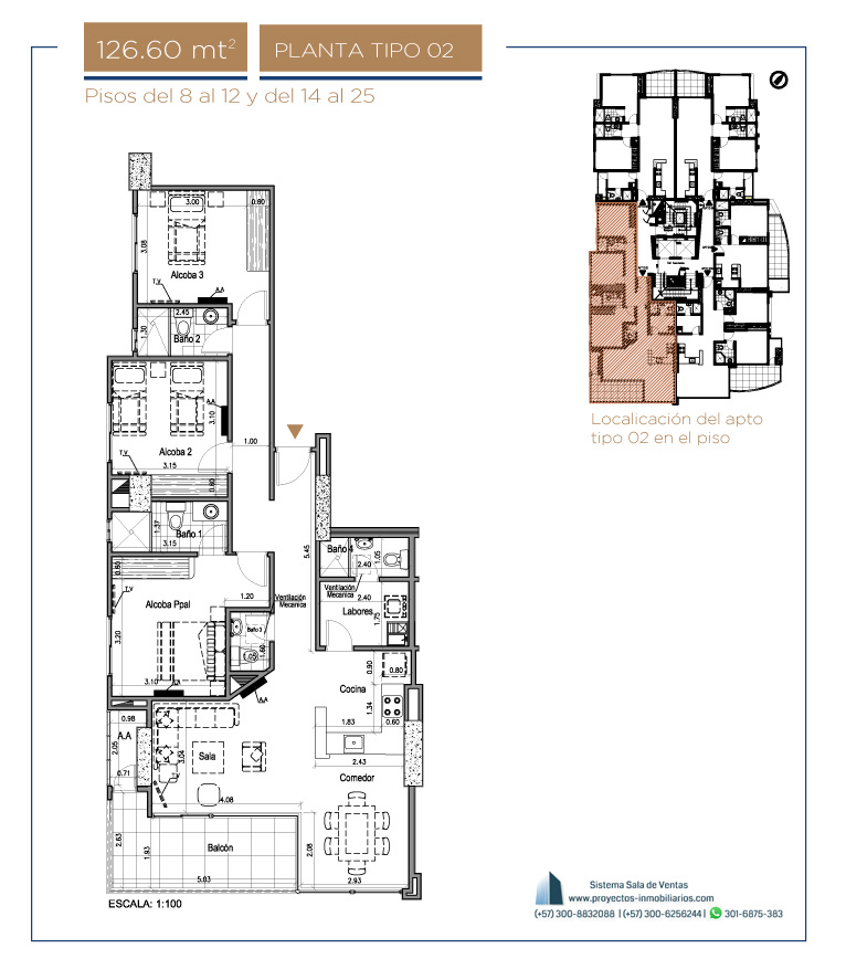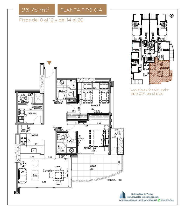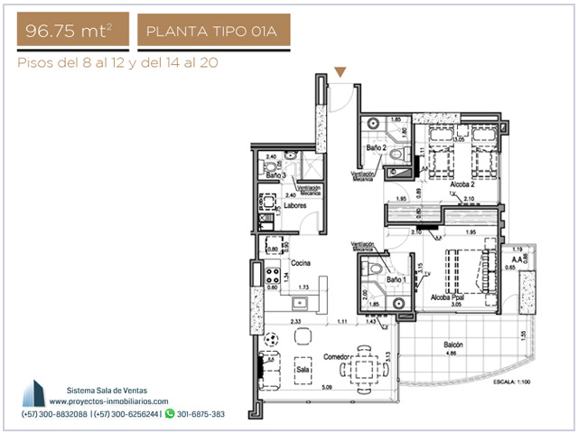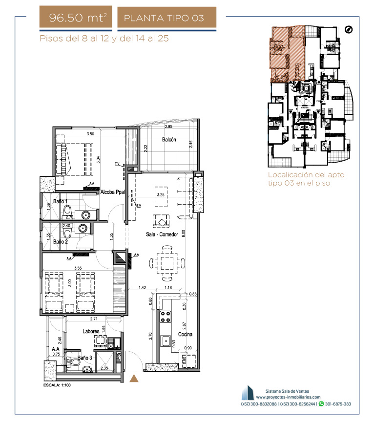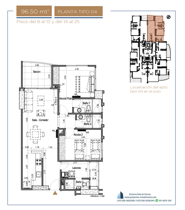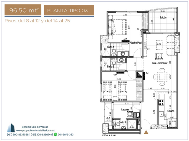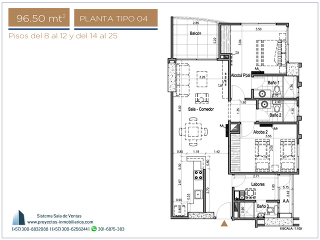 - Apartamento Tipo 03 : Area Total: 96.50 Mts2 (Pisos del 8 al 12 y del 14 al 25) - Apartamento Tipo 04 : Area Total: 96.50 Mts2 (Pisos del 8 al 12 y del 14 al 25)