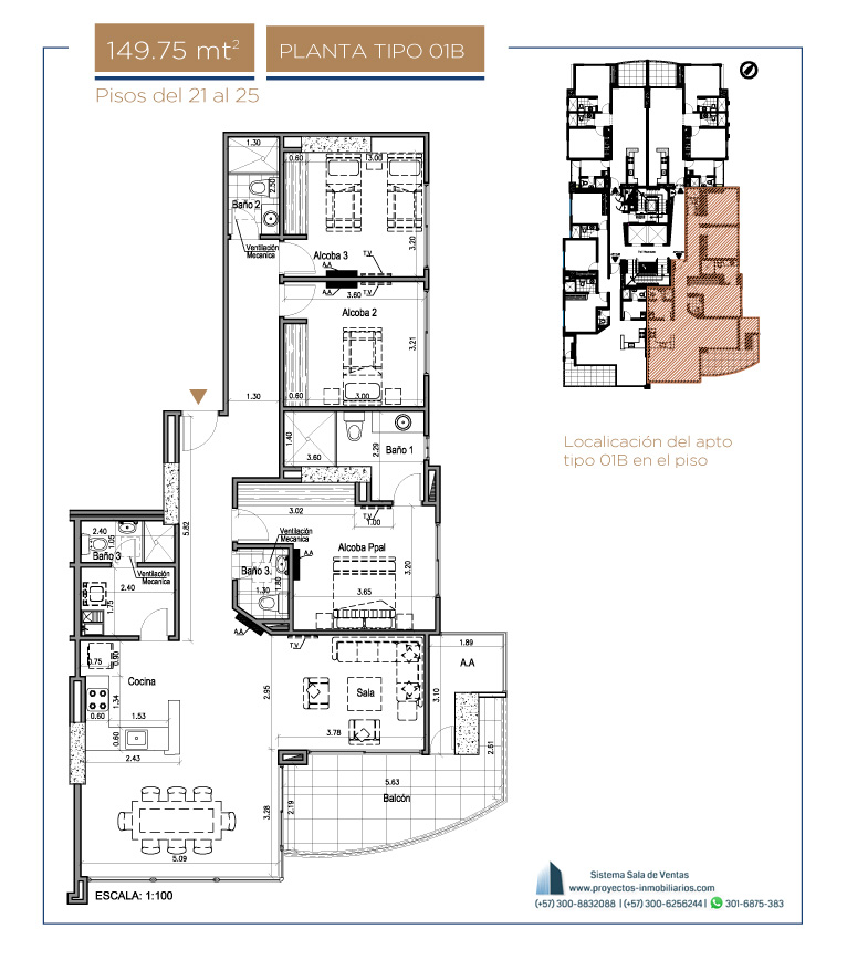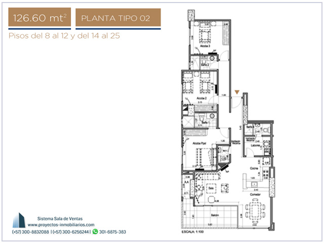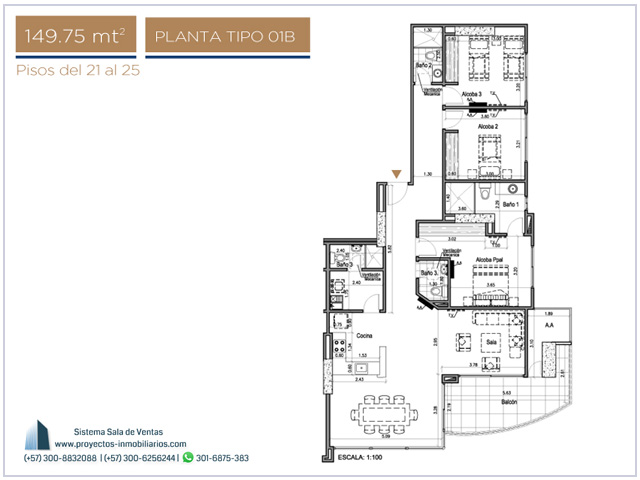 - Apartamento Tipo 01A : Area Total: 96.75 Mts2 (Pisos del 8 al 12 y del 14 al 20) - Apartamento Tipo 01B : Area Total: 149.75 Mts2 (Pisos del 21 al 25) - Apartamento Tipo 02 : Area Total: 126.60 Mts2 (Pisos del 8 al 12 y del 14 al 25)