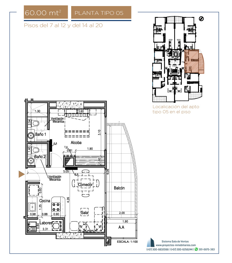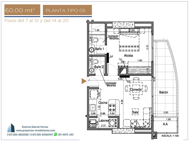 - Apartamento Tipo 05 : Area Total: 60.00 Mts2 (Pisos del 7 al 12 y del 14 al 20)