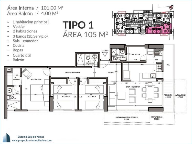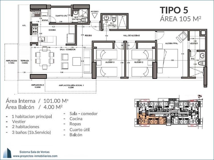 • Área total: 105 m2 • Área interna: 101 m2 • Área total: 4 m2 • Alcobas: 3 • Baños: 3 + baño servicio • Sala - comedor • Cocina • Ropas • Cuarto útil • total