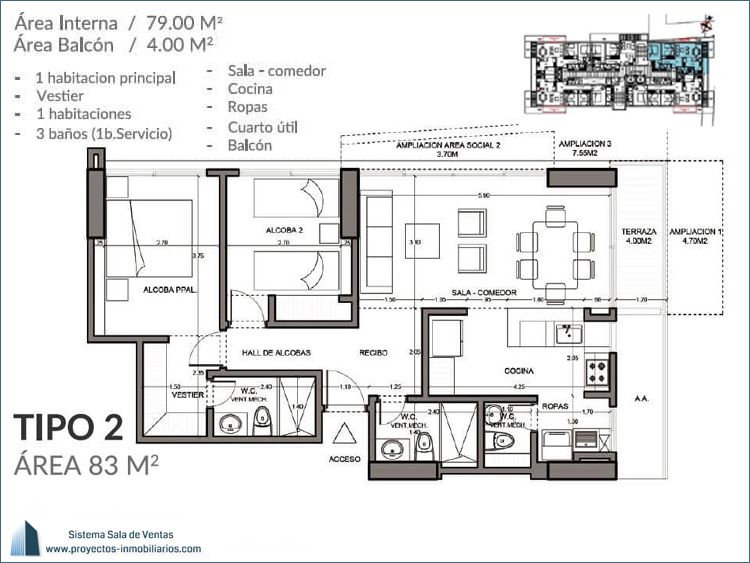 • Área total: 83 m2 • Área interna: 79 m2 • Área total: 4 m2 • Alcobas: 2 • Baños: 3 + baño servicio • Sala - comedor • Cocina • Ropas • Cuarto útil • total