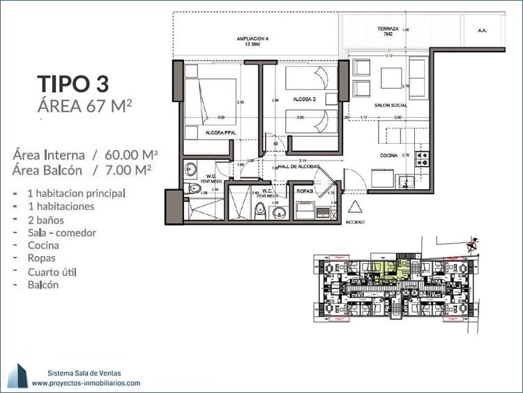 • Área total: 67 m2 • Área interna: 60 m2 • Área total: 7 m2 • Alcobas: 2 • Baños: 2 • Sala - comedor • Cocina • Ropas • Cuarto útil • total