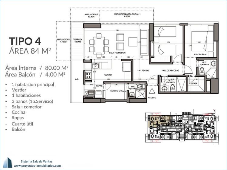 • Área total: 84 m2 • Área interna: 80 m2 • Área total: 4 m2 • Alcobas: 2 • Baños: 3 + baño servicio • Sala - comedor • Cocina • Ropas • Cuarto útil • total