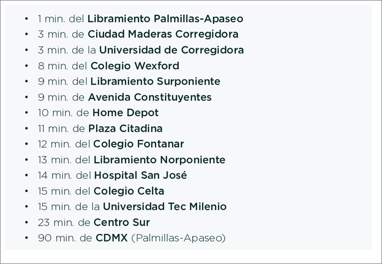 Con gran conectividad hacia las principales arterias de la metrópoli, Av. Constituyentes, Libramientos Surponiente, Norponiente y Palmillas-Apaseo, y servicios como plazas comerciales, universidades, escuelas y hospitales.