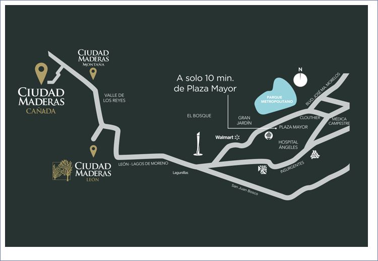 En Ciudad Maderas Cañada contamos con una ubicación privilegiada, al situarnos en el área metropolitana de la ciudad de León, contamos con acceso a rutas y a la red de carreteras de Guanajuato que actualmente es considerada como una de las mejores de México.