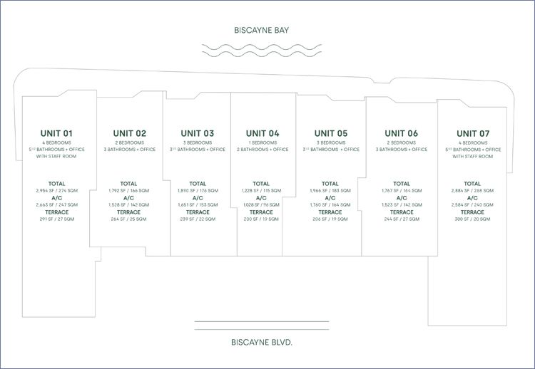 ● Amplias terrazas con vistas a la Bahía de Biscayne.